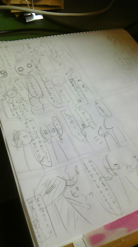 未だ復活しないとか。 調べたら「終わったら勝手に再起動する」とか言ってたので何もいらんことせんと放置してるんですが……… これもし復活しても治ってなかったら本当に原稿提出続く前に一旦修理に出すべきだろうか。。 携帯からもパソコン用のメールボックス見れるようにしてあるんですが、Rさんからのメール見て早く返したい一心です、今。 漫画読みたい………! 何より夏の通販の注文メール、私に届いてないってどういうことだよ。 そんな内容のメールで驚愕してます。 マジ焦ってます。 働け!FC2!!!! サボるんじゃねぇよ!! まだお知り合い様だったからよかったものの(それでも失礼だ)今回はこんなことがないよう注意書きも入れておきます(-.-;) Rさんにはてぃえりあが復活次第、もしくは明日ノートパソコンから返信します………… もう申し訳ないんで夏セット+新刊とか諸々いらないと思いますけど突っ込んでおきます~。 あしたになってもこの状態だったらどうしよう。 どうか回復しますように!! あ、写メは例の3人合作本のネーム。 残り2ページ分出来てません。 4コマ部分もネーム作りました。 ウケることのないしょっぼい4コマですが。 内容(プロット)決まってたんでやりやすかったのはやりやすかったですが、やっぱり一旦全部台詞等決めてからじゃないとダメだった……! 中々進まない。 とりあえず自分達で決めたネーム締切日までには間に合いそう! ルサがヤバい………… 思いつく話、話、既に誰かが書いてそうなものばかりなんですけど!! 頭働かせろオレ~!! 2010.02.11 Thu 22:37:02 す、すいません…………2010.02.11 Thu 18:53:14 てぃえりあ……てぃえりあ!!2010.02.11 Thu 09:45:29 お疲れ様でした!!合宿、お疲れ様でした!!