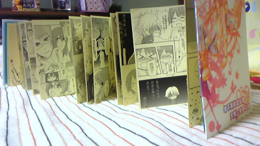 多めに作っていったはずの蛇腹もどき本(写メ参照)が早くも在庫がなくなりそうです。 目標の部数はもう作ってあるので、これがなくなり次第終了です。 物珍しく買って行かれる方が多かった攻彼受彼。 友人内でも何故か欲しいとかいう人が多数出たくらいに何かが間違ってる本。 これ同人です、一応。 同人本ですよ。 大事なことなので2回言いました。 そりゃそうだけどな。 同人で手作りでしかも蛇腹とかないもんね、普通。 でもまだまだ世間は広い。 コピー本とは思えないもっと素晴らしい手作り本と言う名の同人本を作ってる人がいるのですから(何度か見たことがある) きちがいな本を実際に見てみたい&珍しいから欲しいという変わり者の方はお早めにお願いします。 春コミも出ないことですし、 来年5月東京大阪に向けて、和装綴じかハードカバー本を考え中………(まだ先のことなので未定ですが) プリンターを使いすぎなのかはわかりませんが、マゼンタだけがおかしくなった……! 1枚コピーする度にヘッドクリーニングしないと出ないとか完全どっかおかしいよね? あぁたぶんマゼンタの使いすぎだな。 ってことで、キミトラもあるし安い安いプリンター買ってきた。 相変わらずCMYKしかないですが、これで結構なんとかなってるんでいいんです。 4色を馬鹿にしちゃいけないw 今のはマゼンタ以外は好調なんで、今まで通り使えるし! 多色のいいやつは余裕があったら買います。 むしろレーザープリンターが欲しいですけどね。 どこに置くねん!って話なんですけどー 2009.11.05 Thu 07:08:53 決して頭が悪いわけではないおヽ(・∀・)ノ今回のペーパーに使おうとして、解像度の問題で全部パァになったびりタン。 拍手レスです~ 10月30日 烈さん> りりりりりリンクですか!? ありがとうございます!!!! 私もリンク貼ってもいいですか・・・・・・?オソルオソル ゴシル本・・・・・・・!出せたらいいですけどね・・・・・! 時間がねええぇええ!!!! 烈さんも出されるんですね!めっちゃ楽しみですvvv また買いに行きます~♪ いえいえ!当日よろしくお願いします! 11月2日 ぎんたこすさん> お疲れ様です~!!! こちらこそお隣ですごくたのしかったです! フラッグ、近々作りますね^^ 本当ですね・・・・・お会い出来るのだいぶ先ですよね・・・・・泣 スカイプ絵チャしましょう!! 新刊出来次第送ります~ その他、10月30日、11月2日、3日に空パチしてくださった方、ありがとうございました!!!!! 2009.11.04 Wed 21:09:54 終了。2009.11.03 Tue 22:24:09 寒くて寒くて動けない。オレ冬眠する←2009.11.02 Mon 11:18:45 すぱーく=秋祭りスパークお疲れ様でした!!!!