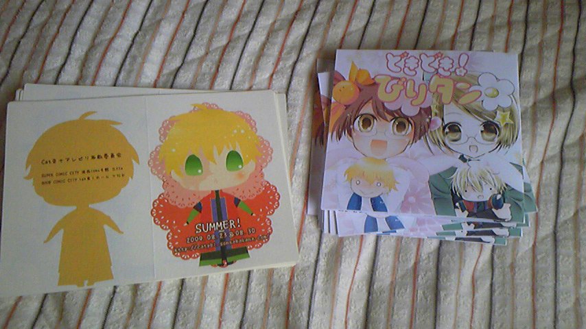 が、パロディすぎて無配すらしてもいいのかって感じなので、こっそり置いておきますー 「びりタン……」とか「無料配布……」とか言ってくだされば、押し付けるかのように差し出します。 ペーパーも結局表の絵柄5種類もあるべ(笑 個人的なオススメは1期ビリーです。 色合いがなんか可愛くなったw そして新刊の製本に飽きた……… さすがに疲れた。。 もういいかな………… あんまり買う人居ないだろうし。部数インテ搬入並に少ないけど。。ブツブツ…… 今回のイベントはマッタリするんだ!! あ、選挙行ってねぇー でもって31日提出のレポートやってねぇ~ めっちゃ忘れてた。 こりゃ東京持ち込みですな……… どうせイベントまで一人で暇だし、マッハで書くよ。 2009.08.28 Fri 12:11:59 onちゃんv |