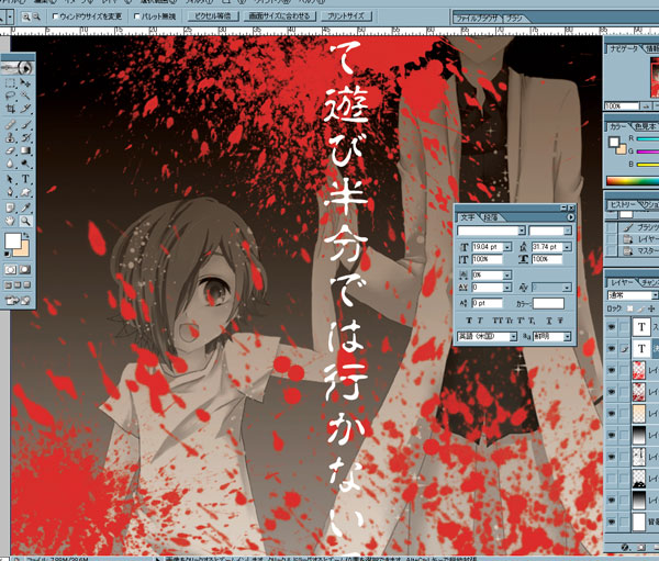 PAGE | 36 37 38 39 40 41 42 43 44 45 46 | ADMIN | WRITE 2009.07.21 Tue 23:59:43 ストップ!〇〇シリーズアレビリ(ハレビリ)本を買って下さっている方は知っているとは思いますが、 アレビリ布教委員会から発行している本には、いつも表紙のパロディポストカードがおまけとして付けています。 「こういうポスターが地球連邦軍に貼ってたら面白いよね!」ってことで、 毎回私がデータを作って生産してるわけですが。 今回のはちょっとホラーすぎたwww まだ途中段階なんですけど。 合作本ではないけど、アレビリ布教委員会から発行するってことで作ったのはいいが、、、、です。 犯罪系で纏めてたのに、さすがに表紙が幸せすぎる二人だったので、 夏に合わせてみました。 私はこういうホラー系大好き人間なんで、気持ち悪くするのは楽しいんですけど(←去年の課題でホラー雑誌を作った人 苦手な方もいらっしゃる&配布するんだからほどほどにしておきますww 背景に人の顔が入るまではきっとしない。 たぶんしない。 この本を買ってくださった勇者様限定にお付けする予定ですー PR 2009.07.21 Tue 11:50:32 あちゃっあちゃー2009.07.20 Mon 12:55:21 昨日。2009.07.19 Sun 04:39:39 更新。2009.07.18 Sat 23:07:17 びりー2009.07.17 Fri 20:01:01 びりタン。2009.07.17 Fri 15:54:27 すーぱー☆はっぴー!!2009.07.16 Thu 18:02:57 予約!2009.07.16 Thu 02:47:23 「小さな恋の謳」雛鳥1巻のアナザーストーリーの表紙絵。 なんかポップにしたかったから、パソコンで塗ってるのはいいけど、 明らかにやっぱり絵柄変わってますよね!!???? やっぱり教育実習→ヲタク展作品の流れで、さほど版権を描いていなかったせいか・・・・・・ もしくはオリジナル描いてて変わってしまったかだ。 どうだろう。 りぼんの仲間入り出来んじゃね?って絵柄だわー 瞳にキラキラがないと評価下がるというりぼん・・・・・・・ この状態で新刊出していいのかと微かに疑問です。 うーん。。。。。 あ、首から下はまだ未完成ですー 拍手ありがとうごさいますーvv >バスケ部 墺受描いたら、買ってくれるって!???笑 あざーすw 描くかどうかは考えときますwwwww |