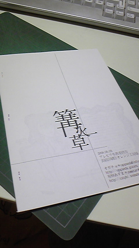 今家に帰って参りました。 夜行バス爆睡ww 携帯の電池もなんとかもってくれた……! いい加減遠出する機会多いんだから、簡易電池?買わなきゃ! 前買ったのにどっかいったとか有り得ん\(^O^)/ スパコミ、お疲れ様でしたー! スペースに立ち寄ってくださった皆様ありがとうございますvv 早速遅刻ですいません。 一般入場時頃来ました。 ええ遅刻魔ですとも。 いつものことですが。 製本が間に合わなかった……! バスでする予定が乗った早々バス酔い。 ダウンしてました。 乗り物酔いが激しいあずまにはやはりバスは強敵でした。勝てない……! そんなわけで東京着いたら2時間ほど某カフェにて製本。 それでもオランジェの製本間に合いませんでしたから………! でもそんなに掃けると思わなかったんで、嬉し動揺w そんなわけで、R:、オランジェ共に完売。 絶対不自由宣言、残り1冊となりました! ペーパー、最後の方渡せなくてすいません;; そんなにいらないだろう!とか高をくくってたら、足りなくなりました……バカ自分!! オランジェは春のシティ 大阪に置けなかったんで、紙もちょっと残ってるしでもしかしたら、次回のスパコミ関西で1、2冊持っていくかもしれません。 絶対不自由宣言はもう本文の紙がないので、再版はなし。 グラビリ本がないので、8月グラビリの新刊出しまーす。 グラビリでスペース取ってるのに、本ないとか詐欺すぎる。 2期幸せ本を!!! シクラメンの方も中身見ずに買って行かはる人が殆どで、え?中身見ないでいいの?有り得ないCPですよ??内容全くないですよ?とツッコミたくなりました(笑) 今回は色んな方にお会い出来て嬉しかったですvv 東京行ってよかった! お菓子等もありがとうございます! ブシドーとビリーが描いているドーナツ、素敵すぎる!! こんなの食べれません!勿体ない! しばらく眺めときますv イベント後はオガチョ様と打ち合わせ。 もうアレビリ本2巻の話で・す・よ! 殆ど決まった感じで、あとは個々の部分の内容を考えてネームなりプロットなり書いていくだけ。 おぉ!早い! 今回も前回と同様、漫画と小説を読まなきゃ話がわからないようになってます。 アレビリ本が出るときは必ず大阪東京に行く!と決めているので(布教のため)、大阪はスパコミ関西、東京はグッコミに参加確定。 とりあえず絡んでくださった皆様&立ち寄って下さった皆様、ありがとうございました! 次回もよろしくお願いします。 次回はスケブ、持って行こう。 勇気出してスケブ頼んでみよう。 明日もイベントなのでまた修羅場ー PR 2009.05.03 Sun 15:00:00 SUPER COMIC CITY 18スパコミ搬入物確定情報ですー! 2009.05.01 Fri 21:34:26 YA☆BA☆I2009.05.01 Fri 02:45:23 鬼スケ2009.04.30 Thu 17:27:20 ぺぃぱぁー今回のペーパーは猫型。