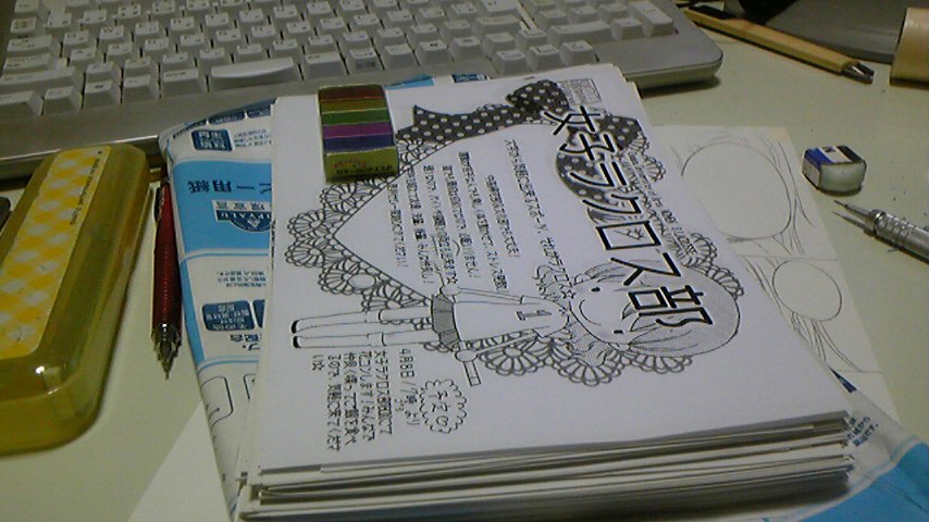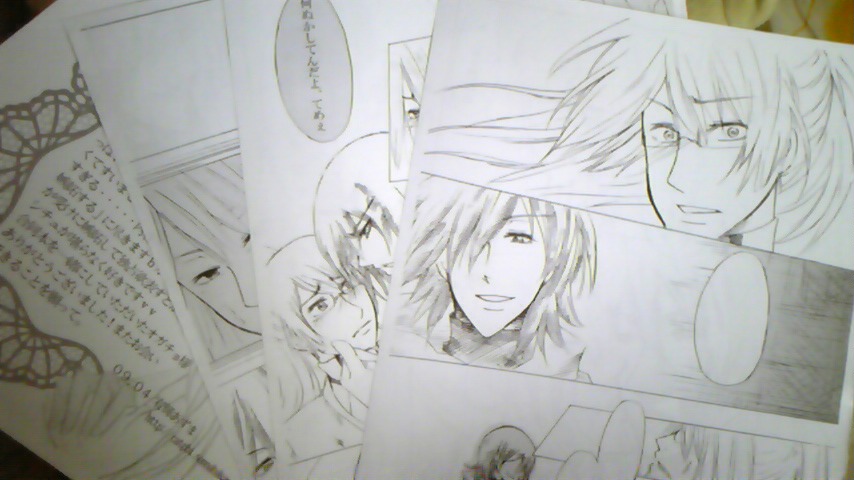 新入生歓迎、略して新歓。 新入生の皆様、サークルに入ってられない方、ご迷惑をおかけします。 勧誘してる方は必死なので、通せん坊します。 無理矢理ビラ受け取らせます。 無理矢理ブースに連れ込みます。 無理矢理アンケート書かせます。 謳い文句は「めっちゃ楽しいから一回体験してみぃ!」「履修でわからんとこあったら相談のるでぇ!」 すいません、すいません。 必死なんです。 今回はビラ作りました! なんともまぁ簡単な感じに。 可愛くが永遠のテーマならくろす部。 今日輪転機?でコピーしてきて、そこにあった裁断機を初めて使いました! あの小学校の職員室に置いてそうな、ガシャコンってするやつ。 あれ、コツいりますねー。 数枚見事にへにゃっへにゃになったんですけどww しかも刃が悪いんか知らんけど、切れないw 無理矢理裁断してやりました! もっと綺麗に切れるんだとばかり思ってたんですけど、今のあずまの力量だとカッターで切ったほうが綺麗だった……! でもほしい、この頃。 2009.04.02 Thu 00:43:14 頂き物vv2009.04.01 Wed 17:54:44 ktkr!!2009.04.01 Wed 00:24:17 見下す目2通販ページ無事開通~!!