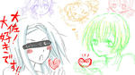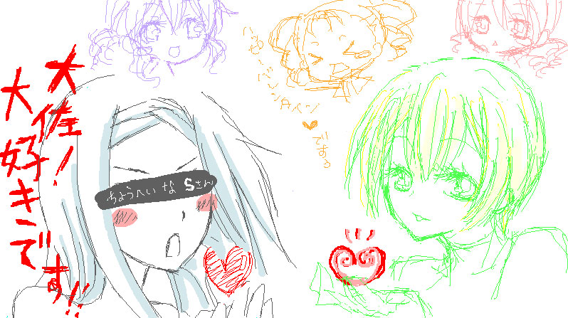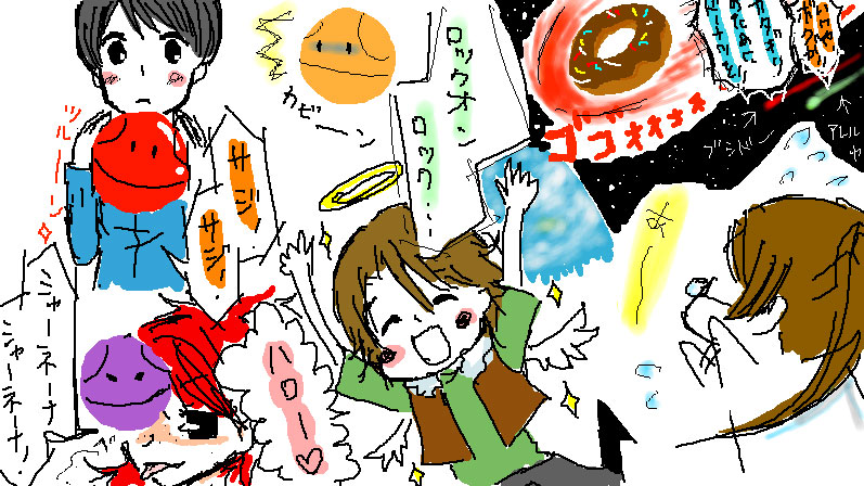 関西限定だった。 全国なものだと思ってた自分って・・・・・。 てか、明後日、用で東京にまた行くんですが、新刊が・・・・・新刊が・・・・・。 どうも製本を東京名古屋でしないといけない羽目になってるんですが、 時間なくて地元で画材を買えそうになく、東京で買わなきゃならない状況に陥ってるんですが、 東京の有名な画材屋さんもしくはオススメ画材屋さん教えてください・・・・!!! 切実に教えてください!! あわよくば連れていってくださ・・・・(殴 ググッてもいっぱい出てくるんだもんな~・・・・ どこがいいとかわからんし。 アニメイトで一般的に売ってるもんなら迷わず行くんだが、置いてるわけないからな~。 う~・・・・・明日行けたらいいのにな・・・・・ 昨日学校行ったときに買えればよかったんだよな、そもそも(←手持ちがなかったw 2009.02.17 Tue 00:18:57 携帯2009.02.16 Mon 00:14:12 絵チャログ。王がついに退場なされたので、追悼も兼ねて。 こういう塗り方ほとんどしないんで、こんなんでいいのかわからんー。 ビリー今回出なかったなぁ~・・・・。 ビリーが出なかった回はなんかテンションが。。。 そろそろ小熊も退場しそうな気配。。 ・・・・・ひろし、今なにしてるんだろね~。 もうあと6回で終わりとか・・・・・・・・・・!!! 凹む。 絵チャログです~! Javaのせいでことごとくはじかれてました・・・・・! 最新版かどうかとかって関係してるんですね~アレ。 今回はほんと、お初な方が居なくてよかったと心底思いました! いたら失礼すぎる・・・・! そんな中お付き合いくださったウサギ&ユタさんありがとうございました。 落書きしかしてないです。 しかもビリーもブシドーもアレルヤも描かなかった絵チャだったなぁ・・・・・・。 バレンタインv ソーマ→あずま それ以外のかわゆい女の子ズ→うさぎ ソマたん、目が以上に気持ち悪かったので消しました(笑 3つのハロから広がったカオス。 ネーナ&橙ハロ&ビリー&ドーナツ→うさぎ サジ&紫ハロ&赤ハロ&ニール兄→あずま ビリーの可愛さに萌えました・・・・・・vv 2009.02.15 Sun 03:28:52 なんか |