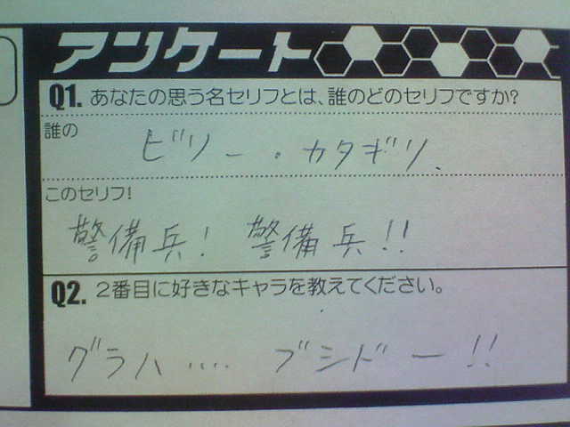 PAGE | 59 60 61 62 63 64 65 66 67 68 69 | ADMIN | WRITE 2009.02.12 Thu 12:23:54 あわわわわ………!2009.02.11 Wed 17:44:40 DOUBLE ATTACK in博多2DA博多の申込書にはアンケートがあって、そのアンケートの名セリフに「警備兵!警備兵!!」と書く自分バカす。